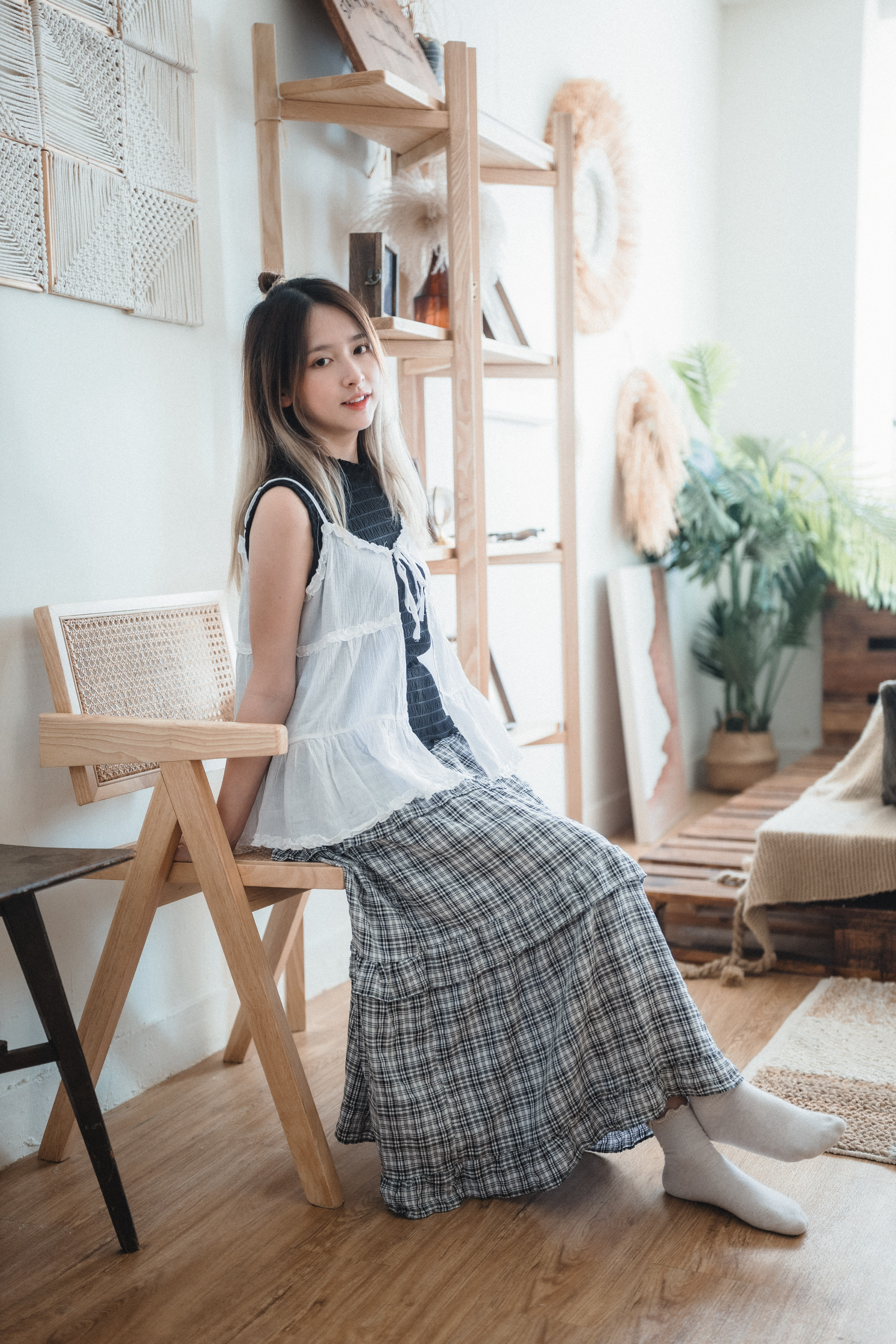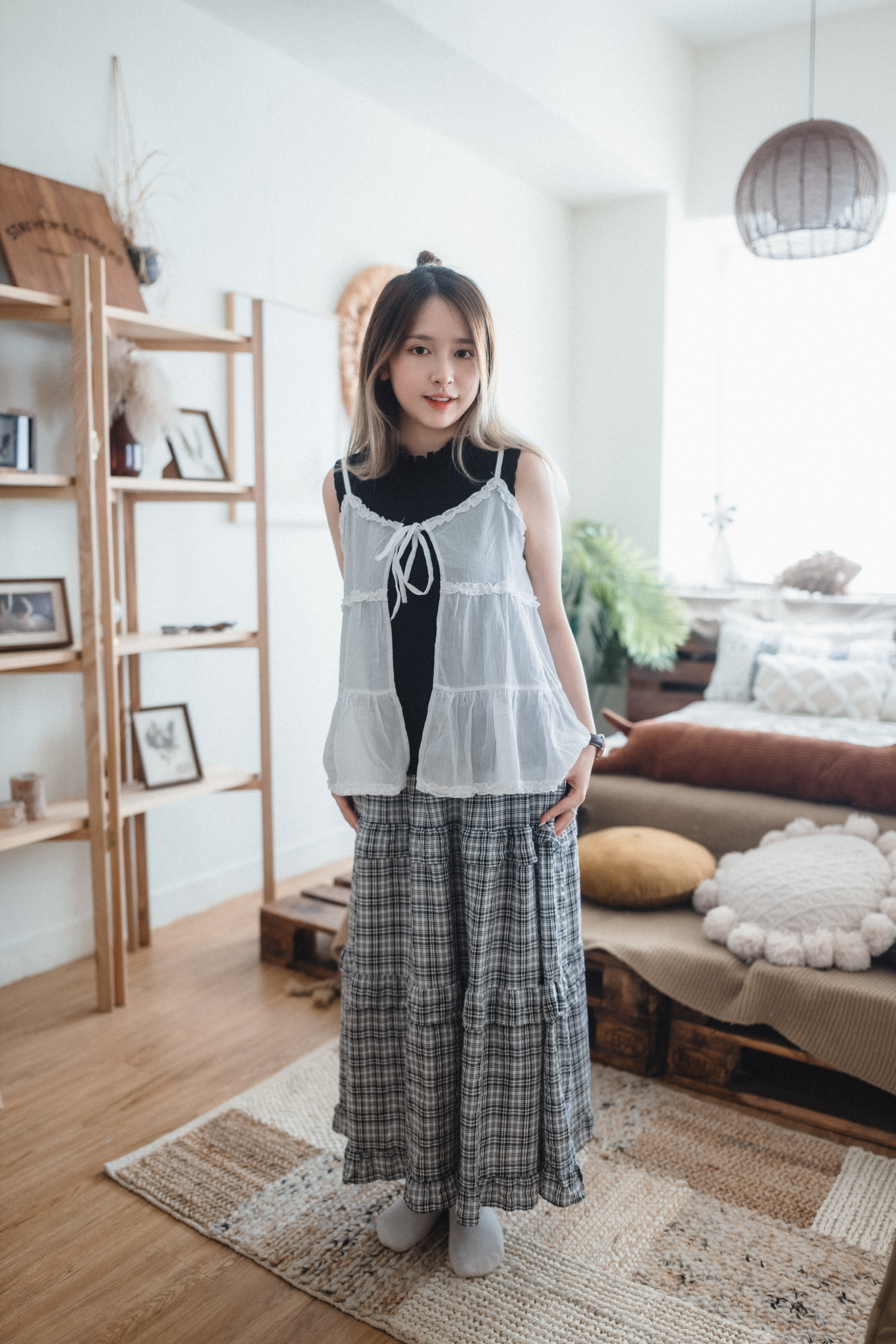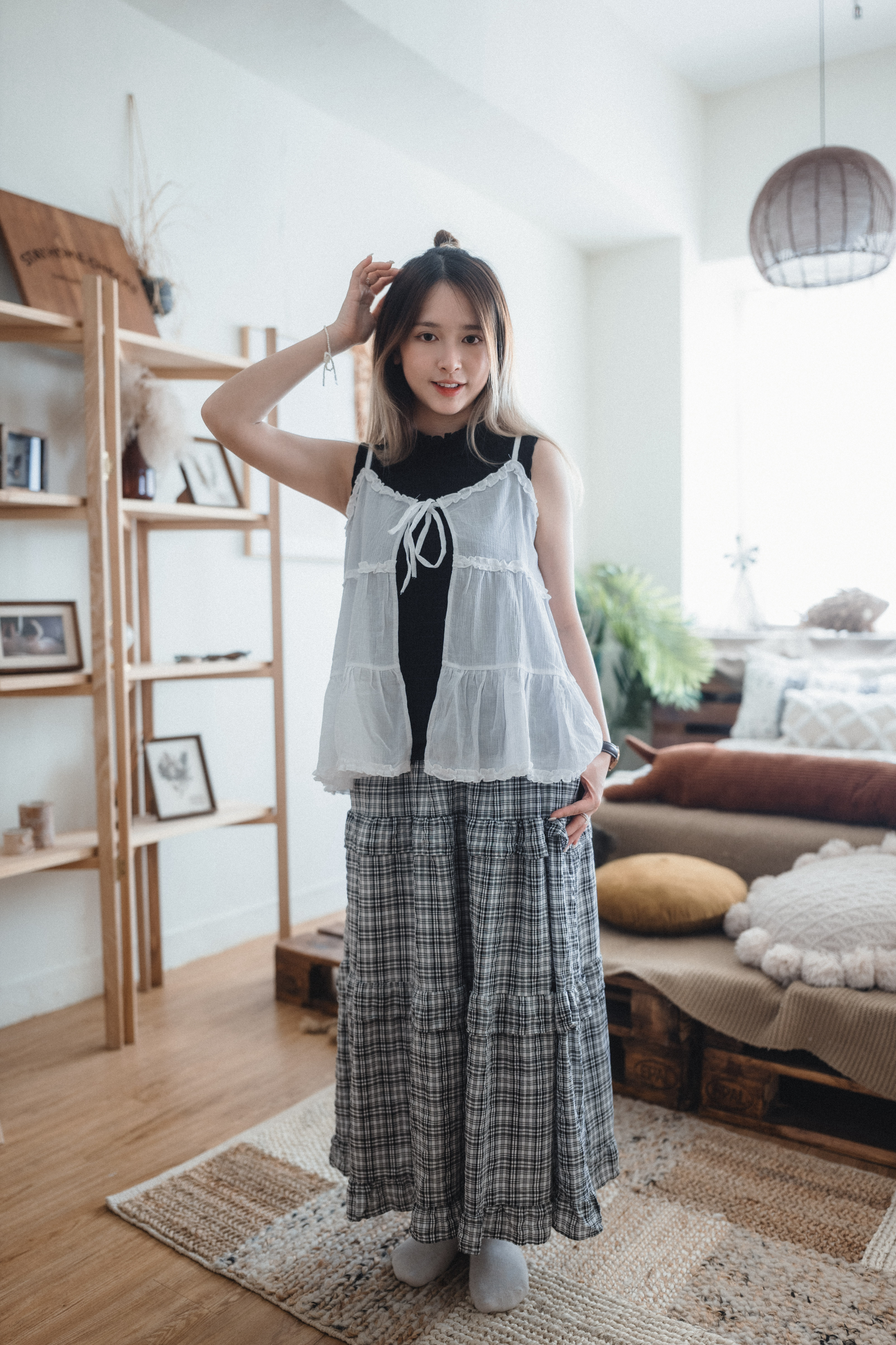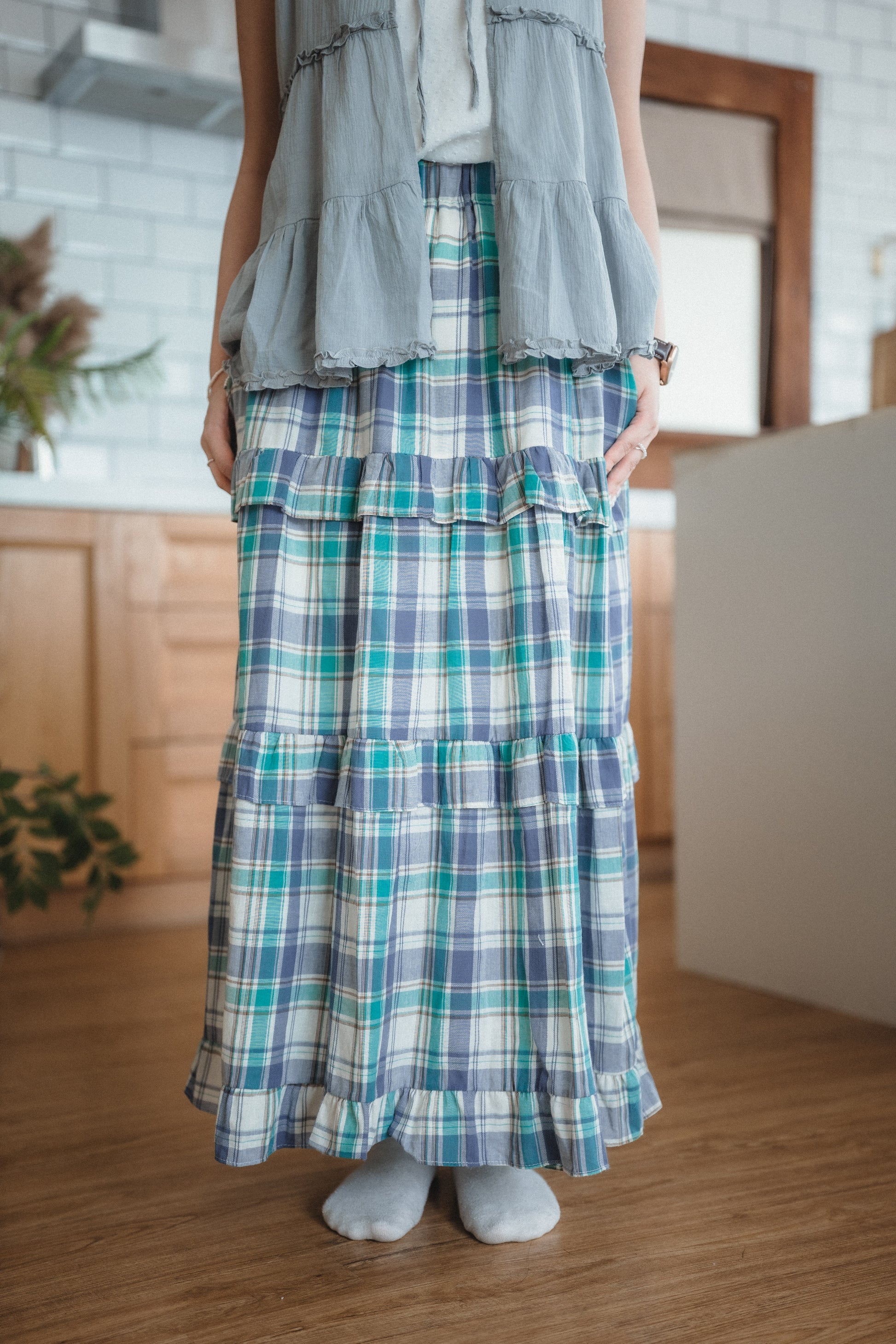 日系格子Ruffle邊大裙襬傘裙|2色入