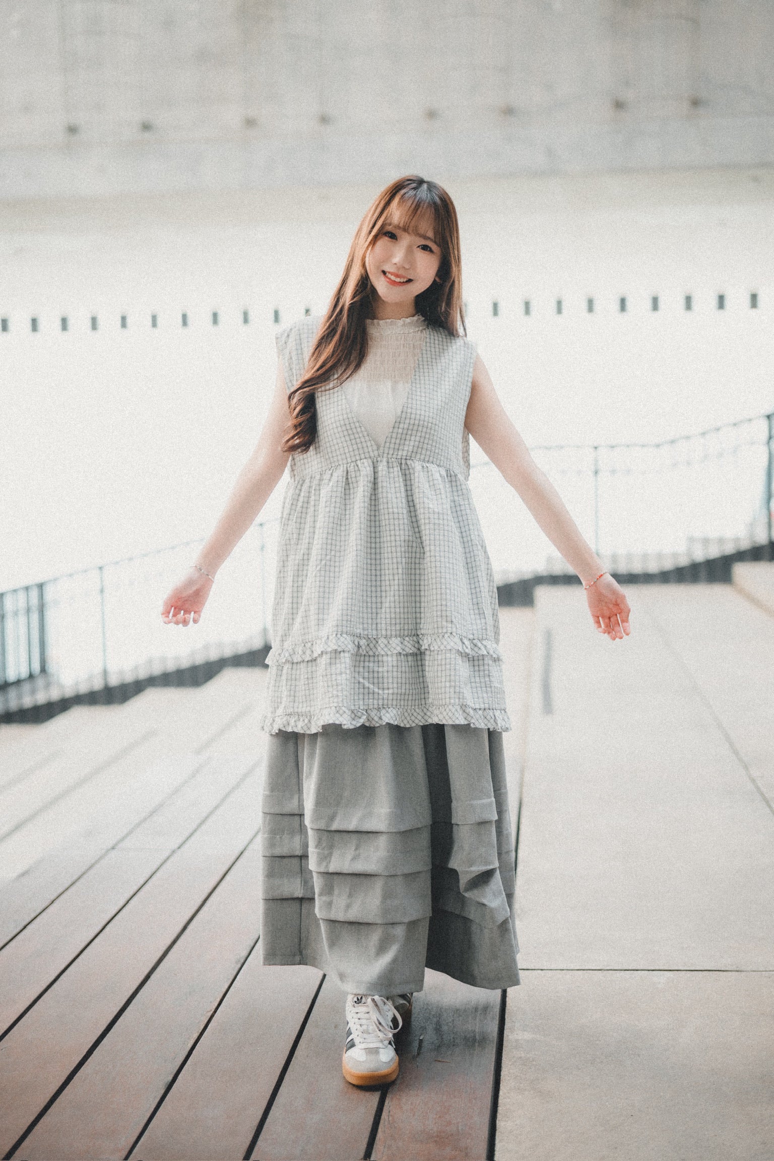特色在於裙襬位置的三層褶褶壓布!